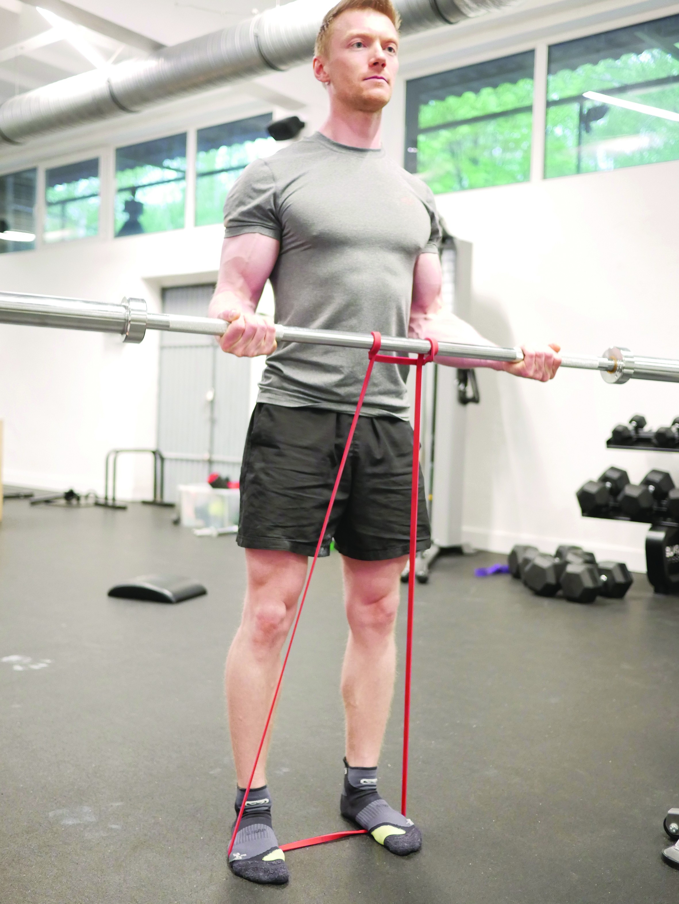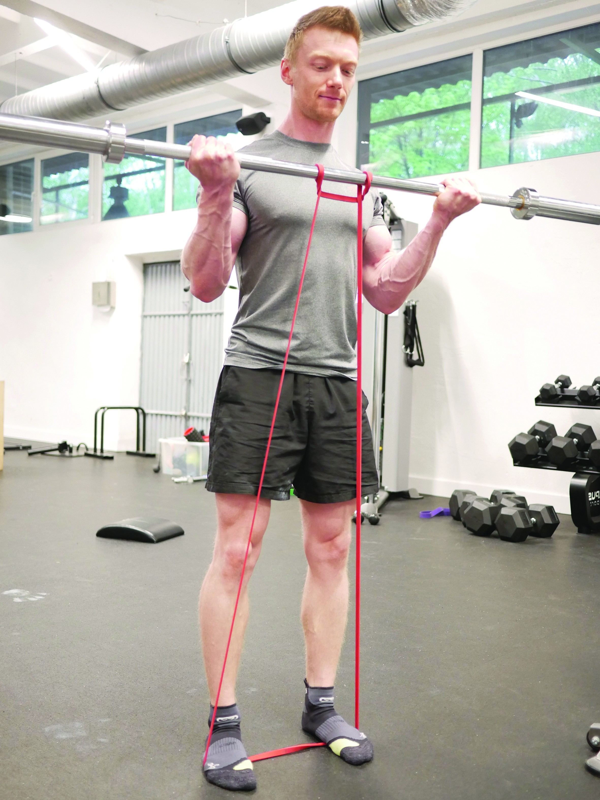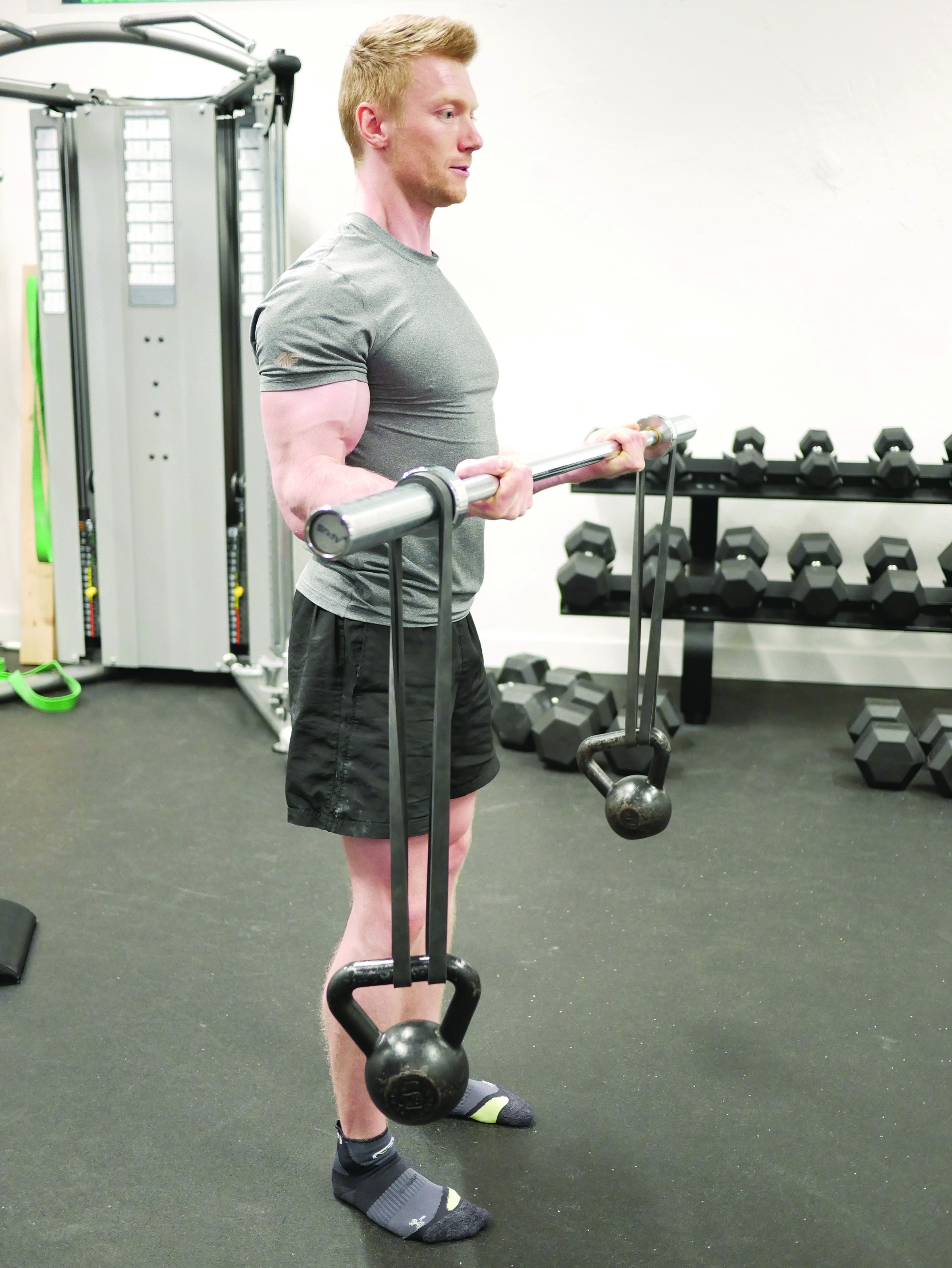 Poprzez doczepienie dodatkowych obciążeń na gumie wprowadzamy sztangę w oscylację, utrudniając w ten sposób uginania i dodając nowe bodźce. Pomijając fakt dobrego wpływu takiego rodzaju pracy na core, zdecydowanie pobudzimy więcej jednostek motorycznych, tym samym silniej wpływając na budowanie masy mięśniowej (zdj. 13).