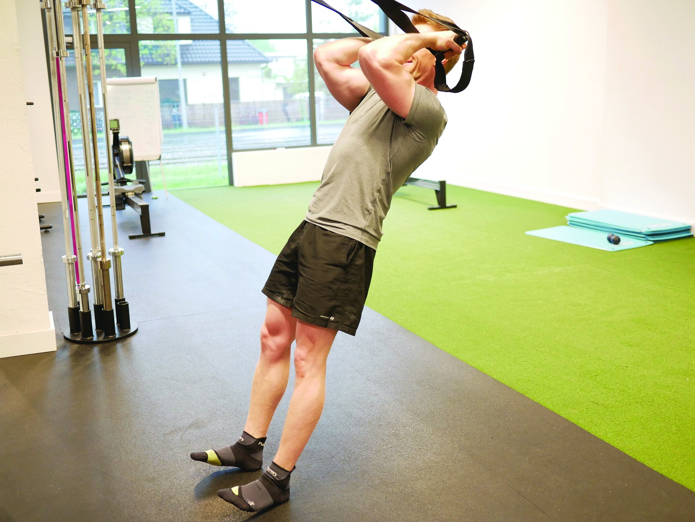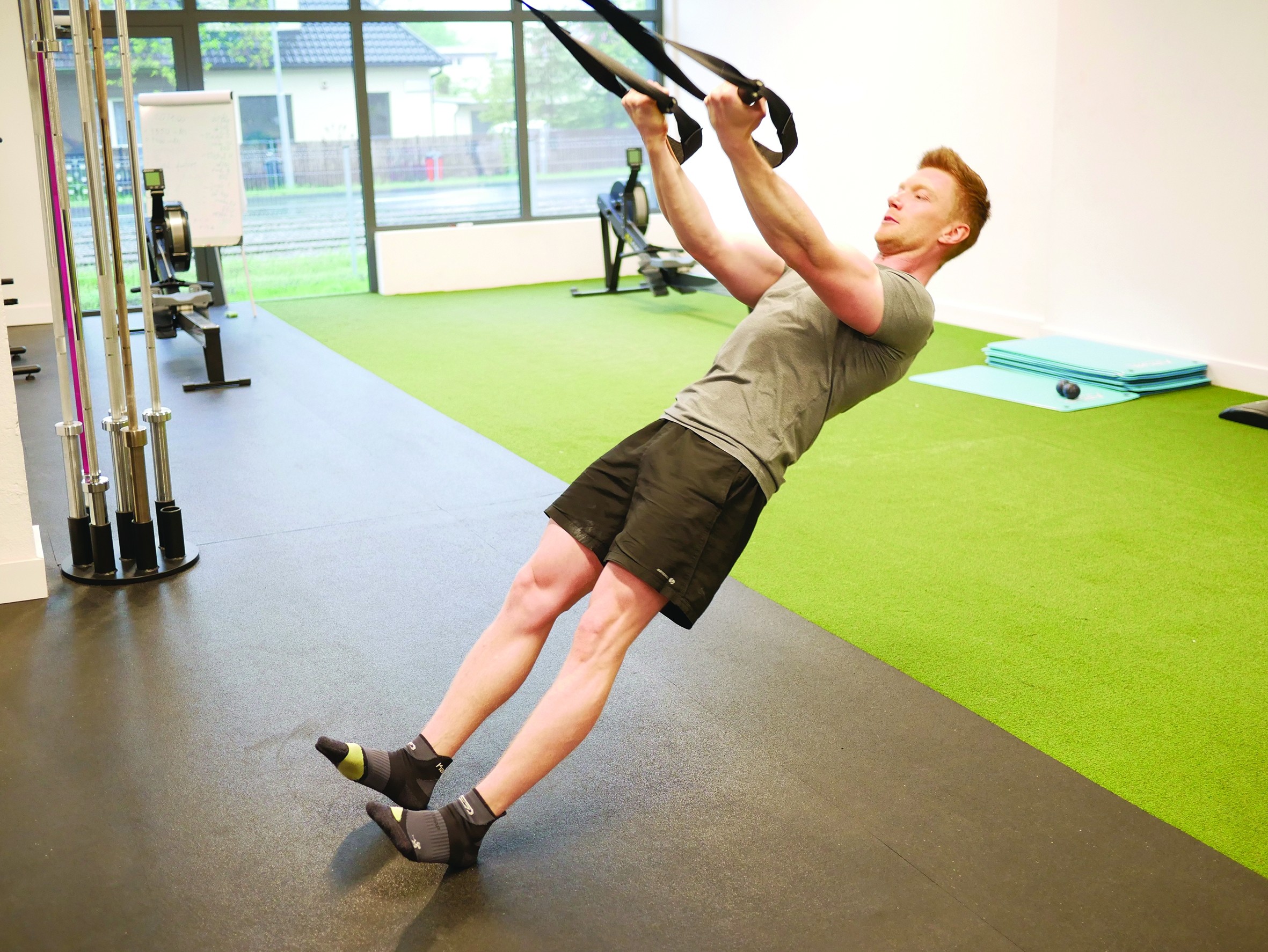 Aby wypróbować pracę na TRX-ie, przytrzymuj uchwyty z neutralnym chwytem (dłonie zwrócone do siebie) i odchyl się do tyłu. Rozpocznij od ruchu „zawijania” ramion w kierunku głowy. Pozwól, aby dłonie obracały się naturalnie, gdy będą zbliżały się do twarzy (zdj. 17, 18).
