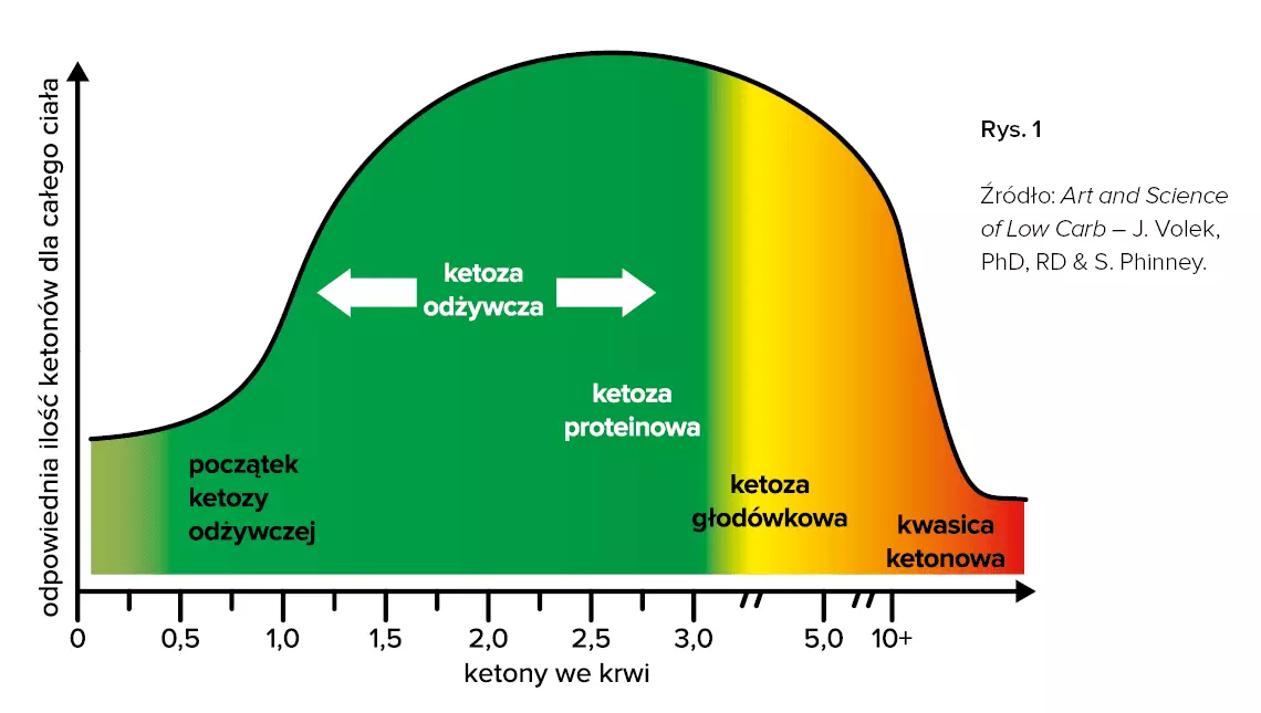 Bardzo ciekawie i praktycznie opisali „odżywczą ketozę” (nutritional ketosis) Volek i Phinney w książce pt.: The Art and Science of Low Carbohydrate Living – na prostym wykresie pokazali, jaki poziom ketonów we krwi mamy, gdy jesteśmy dobrze zaadaptowani do diety ketogenicznej oraz jak ten poziom wygląda po treningu, przy głodówce oraz w niekontrolowanej cukrzycy typu I.