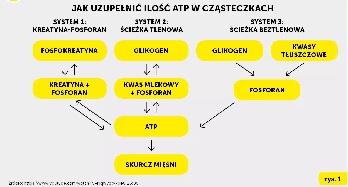 Jak już wspomniałem wcześniej, są trzy źródła, dzięki którym możemy zwiększyć ilość dostępnego ATP. Są to: kreatyna, glukoza (glikogen) oraz kwasy tłuszczowe (rys. 1).