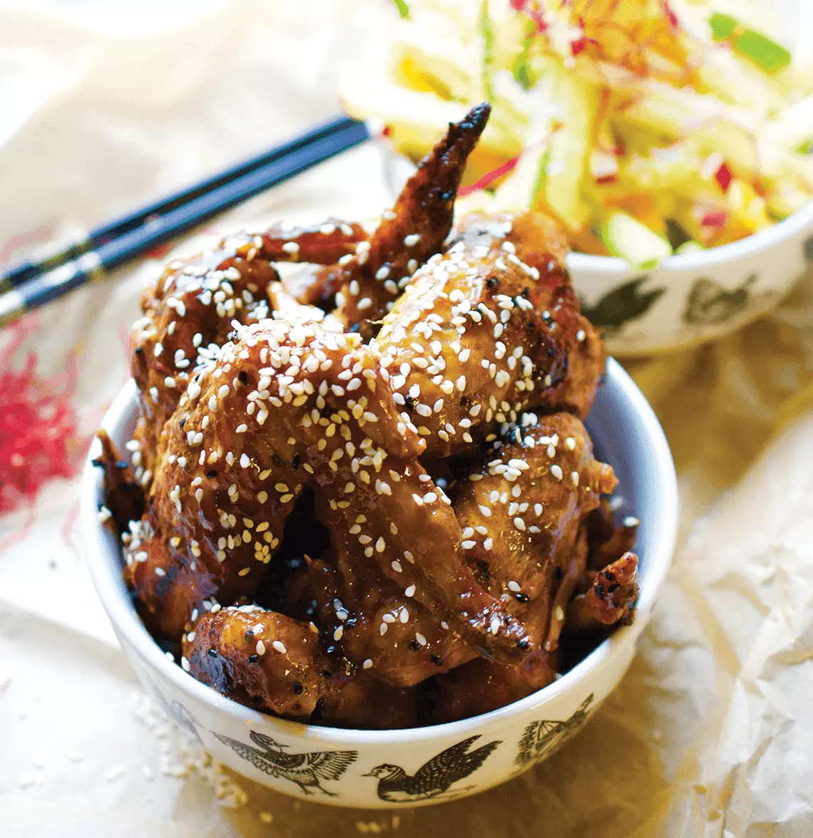 Uwielbiam to danie. Jest idealne na wieczory ze znajomymi. Słodkawy i pikantny sos, w którym zanurzone są skrzydełka, będzie idealny do komosy ryżowej, makaronu konjak, dzikiego ryżu czy jako dodatek do długich wstążek wyciętych z białej rzodkwi, marchewek, ogórka i jabłka.