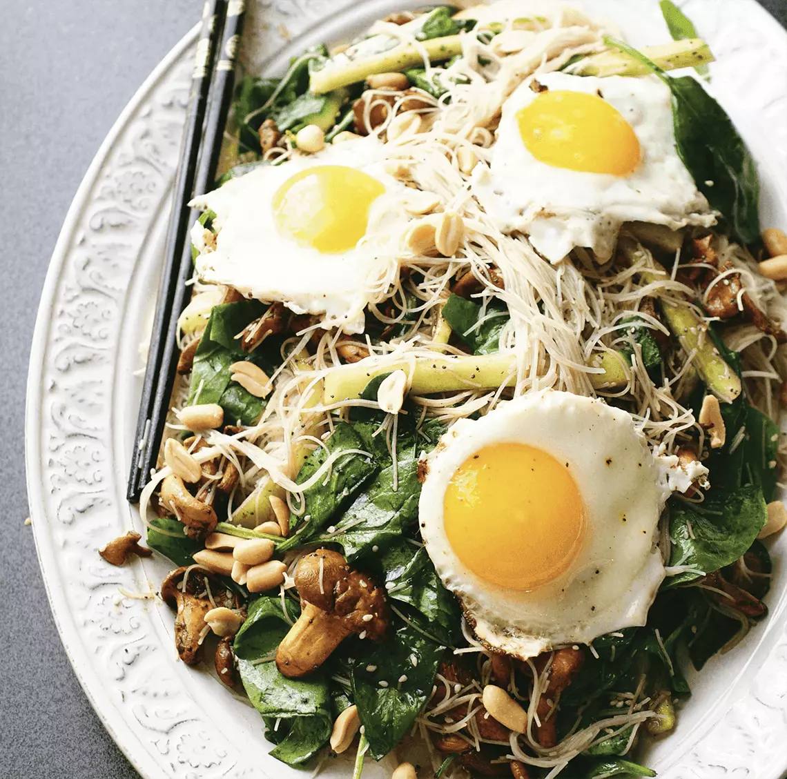 To prawdziwa makaronowa uczta. Jeżeli chcesz, możesz makaron kelp zamienić cieniutkim makaronem ryżowym – danie będzie równie smaczne. Moim ulubionym elementem całej potrawy są sadzone jajka, które po przekrojeniu efektownie wylewają się na całość, oblewając potrawę płynnym żółtkiem.