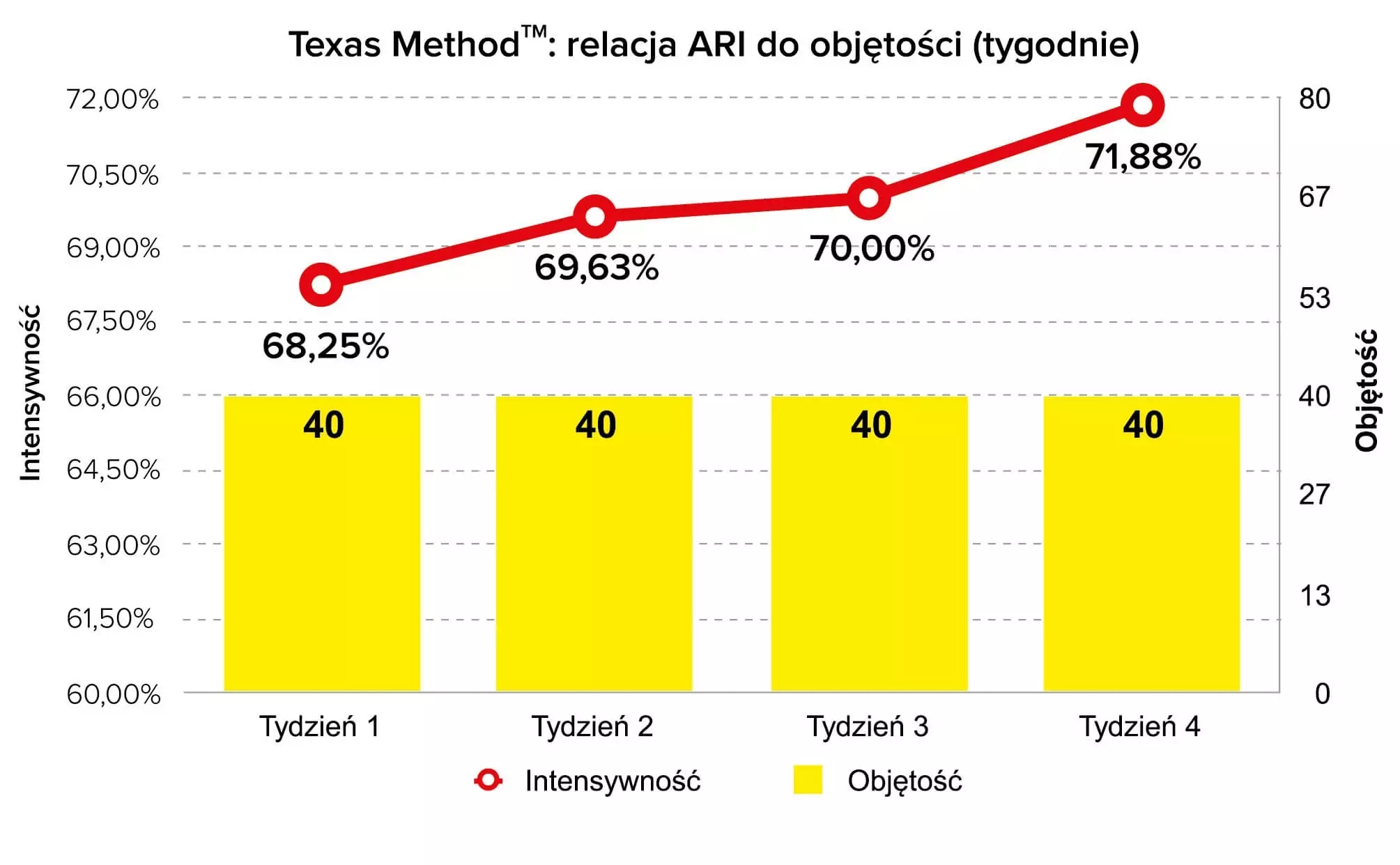 - ARI – średnia ważona intensywności; wartość procentowa 1RM.